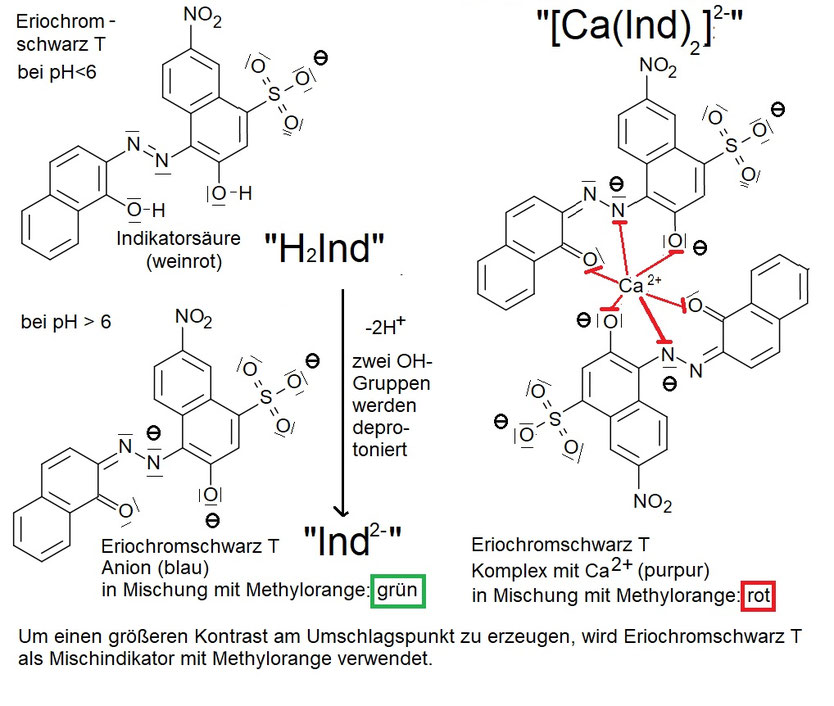 Die intensive Farbe wird durch die Azogruppe bedingt und die Wasserlöslichkeit durch die Sulfonsäuregruppe. Dazu versetzte man mit überschüssiger ÄDTA-Lösung und titrierte gegen Eriochromschwarz T als Indicator zurück. Wässrige Lösungen von Eriochromschwarz sind bis zu einem pH-Wert von 6 weinrot.